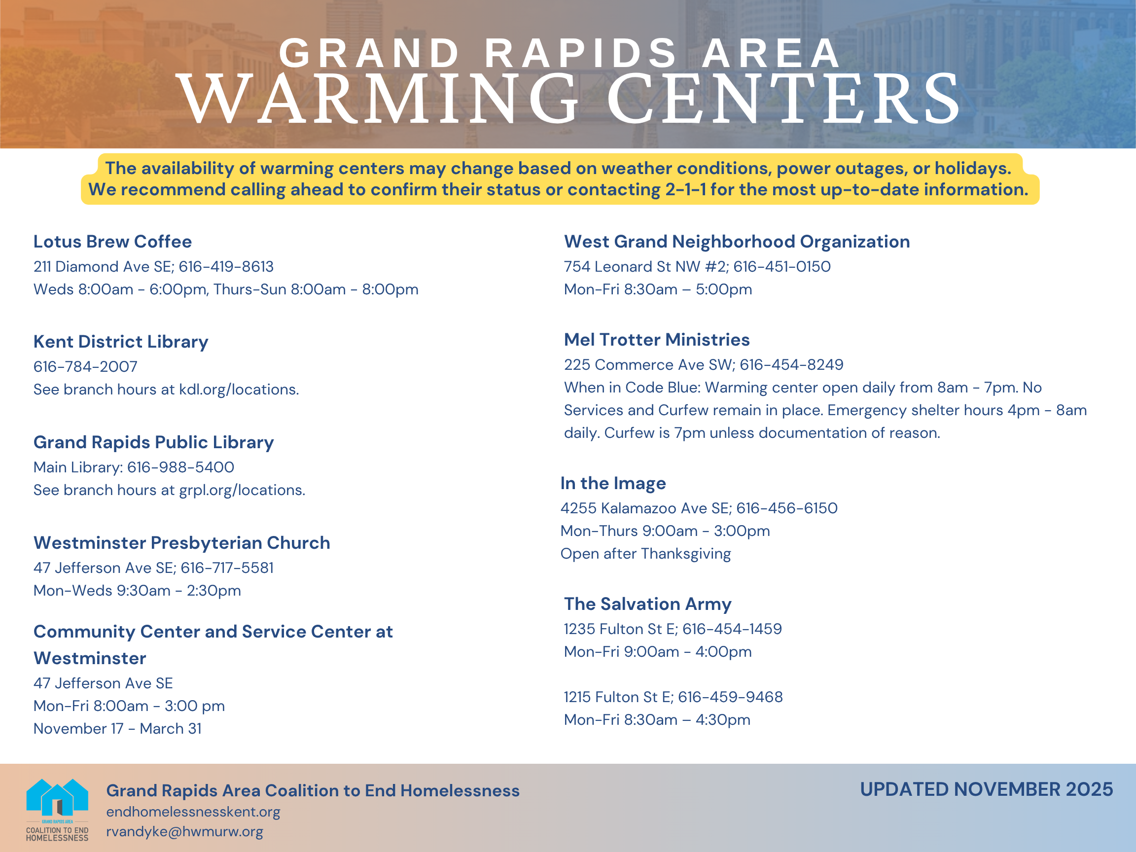 Below is a list of warming centers throughout Kent County. Click here for a shareable flyer. Please encourage anyone outside or in a place not meant for habitation to connect with a shelter and/or warming center. Call 2-1-1 to identify additional resources.