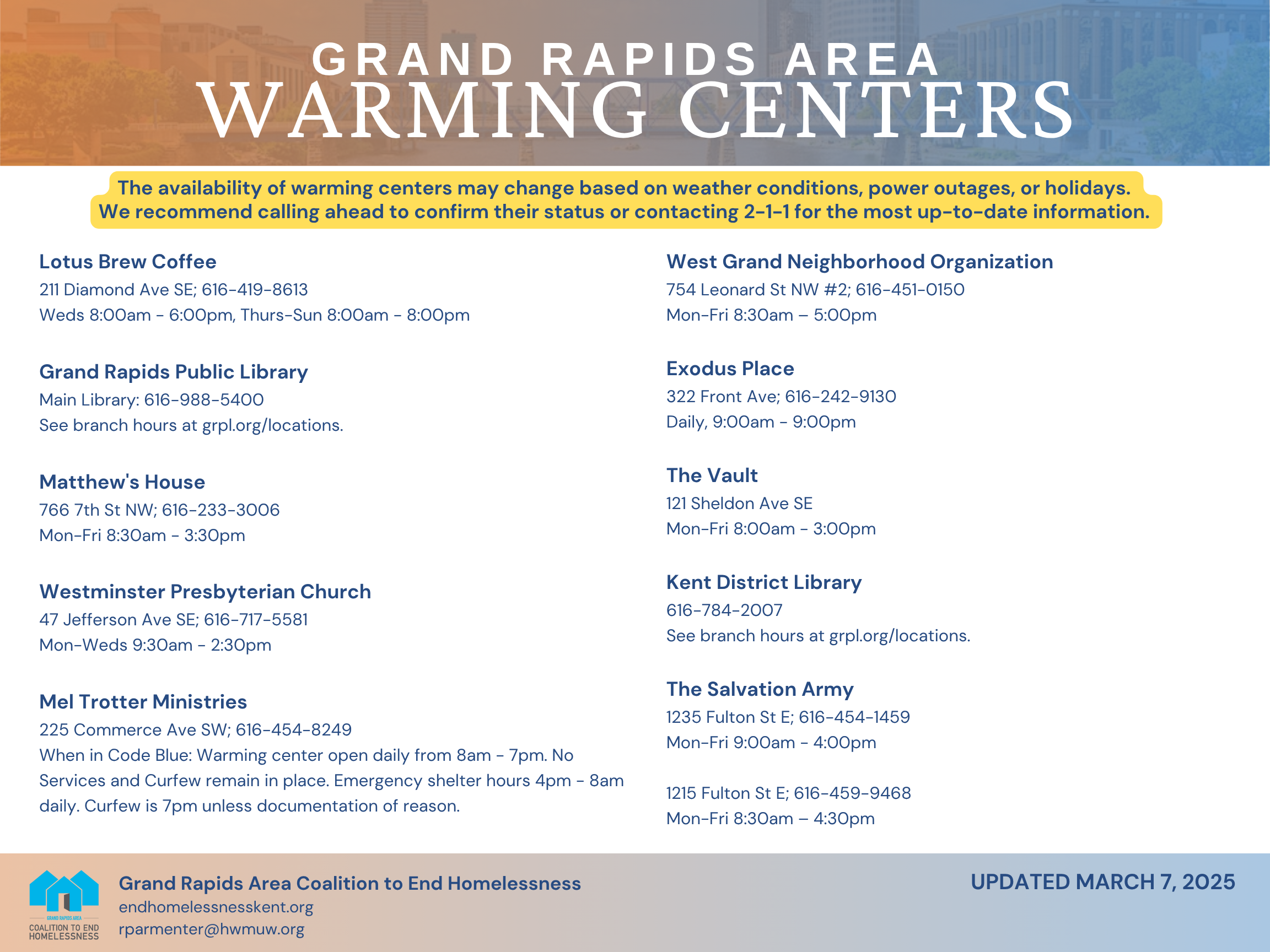 Below is a list of warming centers throughout Kent County. Click here for a shareable flyer. Please encourage anyone outside or in a place not meant for habitation to connect with a shelter and/or warming center. Call 2-1-1 to identify additional resources.